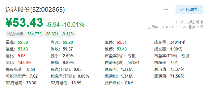 乐居财经讯刘治颖 1月7日,截止10:17分,钧达股份(SZ002865)跌停,下跌10.01%,现报53.43元,成交额1.9亿元,总市值73.37亿元。