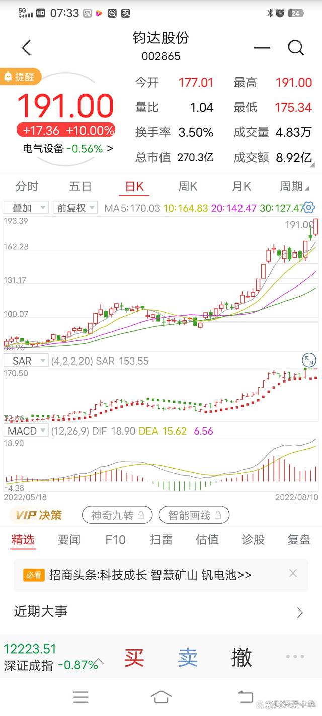 8月10日早盘钧达股份高开高走,午盘连续上扬再度封板,收市报191.00元,涨幅17.36元或10.00%,市值270亿,年内开市报70.09元,涨幅120.09元或172.86%,今年最牛的个股,非钧达股份莫属,当之无愧!