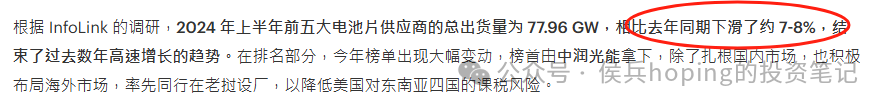 2024年前五大电池供应商整体出货同比下滑7-8%,表明专业化企业也正在受到一体化的冲击和市场竞争加剧的冲击。