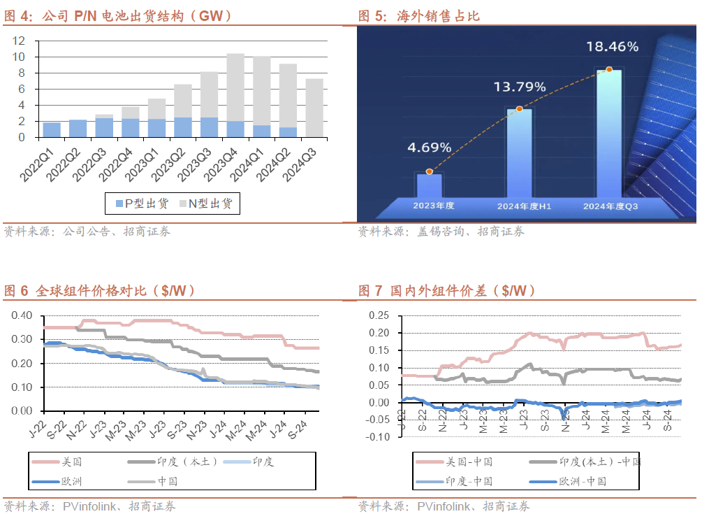 前瞻布局中东制造基地,有望再次抓住机遇期。1)出口比例持续提升:2023年公司海外销售占比4.69%,今年前三季度海外销售占比大幅提升至18.46%,尤其在印度、土耳其、欧洲等市场占有率领先,海外贡献逐步体现。2)前瞻布局中东:今年6月公司公告拟在阿曼投资建设高效光伏电池产能,首期5GW预计年内开工,2025年中投产。阿曼项目终端主要面向北美、欧洲市场。美国、欧洲本土电池片制造缺口大,也很难短期形成有效的电池供应,美国等高价值市场电池片存在明显缺口;预计公司中东产能有望获得超额回报。