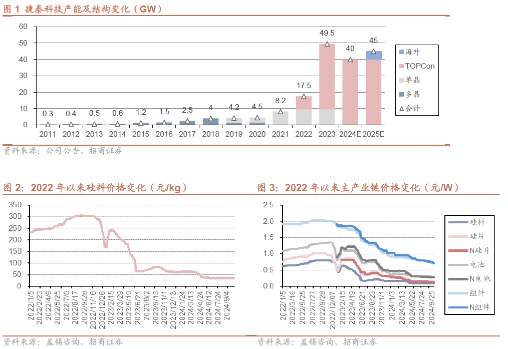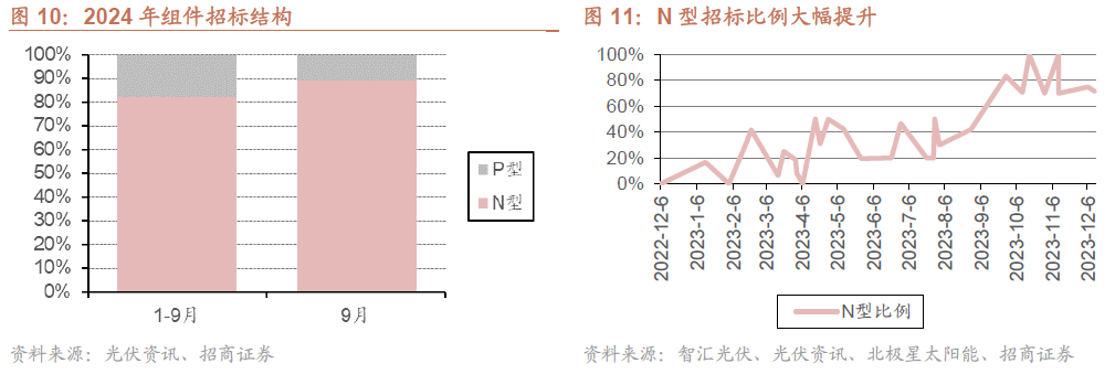 前三季度国内N型招标比例已经超过90%,市场全面转向意味存量P型产能的被动出清,主流TOPCon目前已披露产能在750-800GW,总量相对硅料、硅片而言最小。
