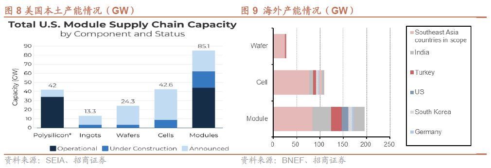 前瞻布局中东制造基地,有望再次抓住机遇期。今年6月公司公告拟在阿曼投资建设高效光伏电池产能,首期5GW预计年内开工,2025年中投产。阿曼项目终端主要面向北美、欧洲市场。美国、欧洲本土电池片制造缺口大,也很难短期形成有效的电池供应,美国等高价值市场电池片存在明显缺口;预计公司中东产能有望获得超额回报。