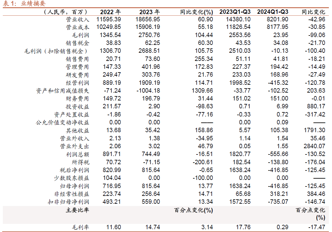 公司公告前三季度实现收入、归上净利润、扣非净利润82.02、-4.17、-7.35亿元,同比下滑42.96%、125.45%、146.74%,其中Q3单季度收入、归上净利润、扣非净利润18.28、-2.51、-3.45亿元。