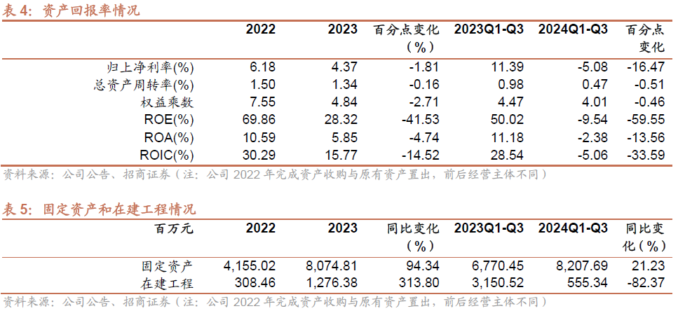 产业链价格调整影响当期业绩,底部体现经营韧性。光伏产业链价格大幅调整,全行业盈利承压,公司收入、利润同比出现明显调整,产业底部公司更加注重经营效率,在持续推动新市场拓展的前提下,Q1-3公司费用总额同比下降1亿左右,非经常性损益主要系补贴等,此外Q3计提存货等资产减值约0.27亿。公司当前产能计划均在2022年及以前提出(公司是国内最早实现大规模N型量产的三方电池厂),随国内两大基地逐步投产公司固定资产增至82亿,在建工程降至5.6亿,后续扩张重心更侧重海外及新技术。