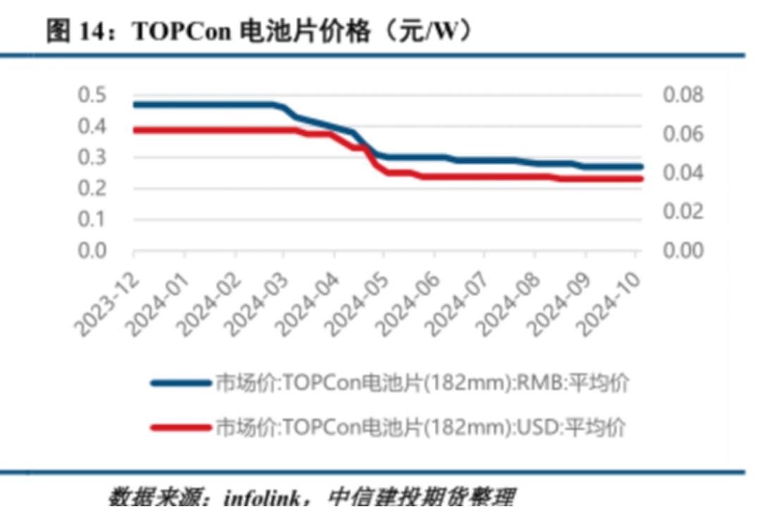 InfoLink Consulting 统计的数据显示,2024年,TOPCon电池片的价格一路下行,从年初的0.47元/W下跌至年末的0.28元/W,降幅高达40%。
