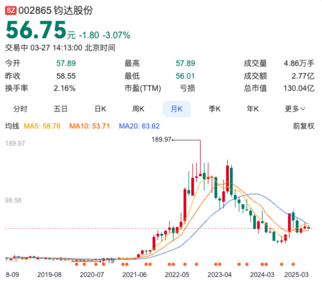 与业绩飞速攀升相同步,钧达股份的股价也开始腾飞。2022年11月,钧达股份的股价达189.97元/股的高点,相较转型前10元/股左右的股价,翻了近20倍。