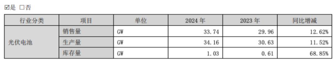 财报显示,2024年,钧达股份光伏电池片的生产量为34.16GW,同比增长11.52%;销售量为33.74GW,同比增长12.62%,产销率达98.77%。然而遗憾的是,同期钧达股份光伏电池片业务的营收为99.24亿元,同比暴跌46.73%,毛利率仅为0.48%,同比下跌14.21个百分点。