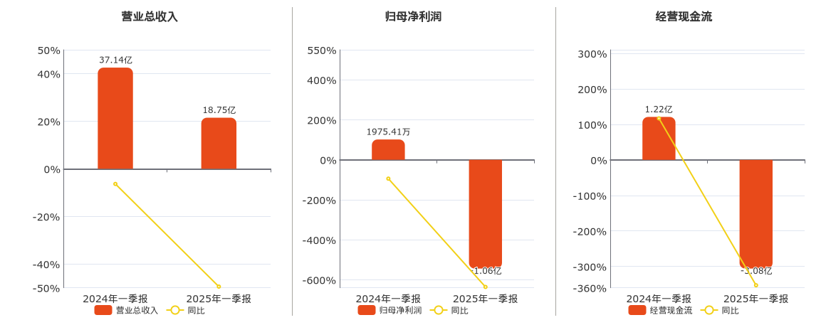 公司营业总收入为18.75亿元,较去年同报告期营业总收入减少18.39亿元,同比较去年同期下降49.52%。归母净利润为-1.06亿元,较去年同报告期归母净利润减少1.26亿元,同比较去年同期下降636.04%。经营活动现金净流入为-3.08亿元,较去年同报告期经营活动现金净流入减少4.30亿元,同比较去年同期下降353.02%。