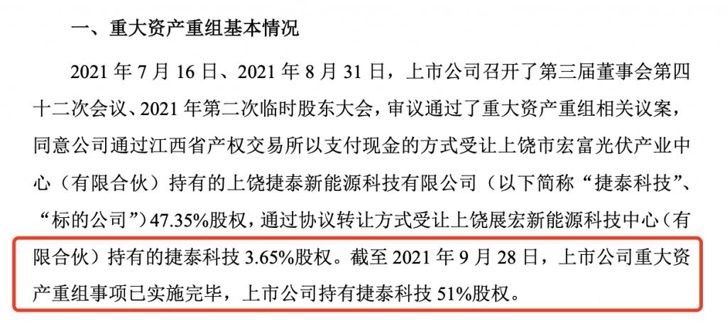 2021 年 9 月,公司通过收购上饶捷泰新能源科技有限公司(以下简称"捷泰科技")51%的股权进入光伏行业。