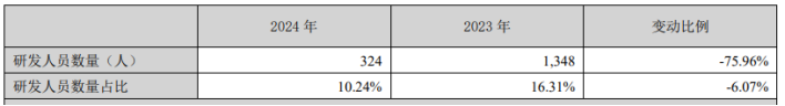 注意到,除生产人员大幅收缩外,研发人员也遭遇大幅裁员。2024年,研发人员数量同比直降超七成,由2023年的1348人缩减至324人。其研发投入也同步下滑34.58%至1.99亿元。