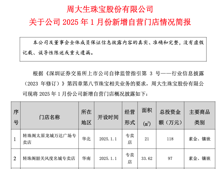 2月18日,周大生发布关于公司1月份新增自营门店情况简报,当月新增44家门店,比2024年同期门店数目增长300%;新开门店均为专卖店及联营专柜,共投资1.15亿元。而2024年四季度才共新开门店17家。