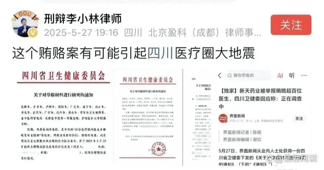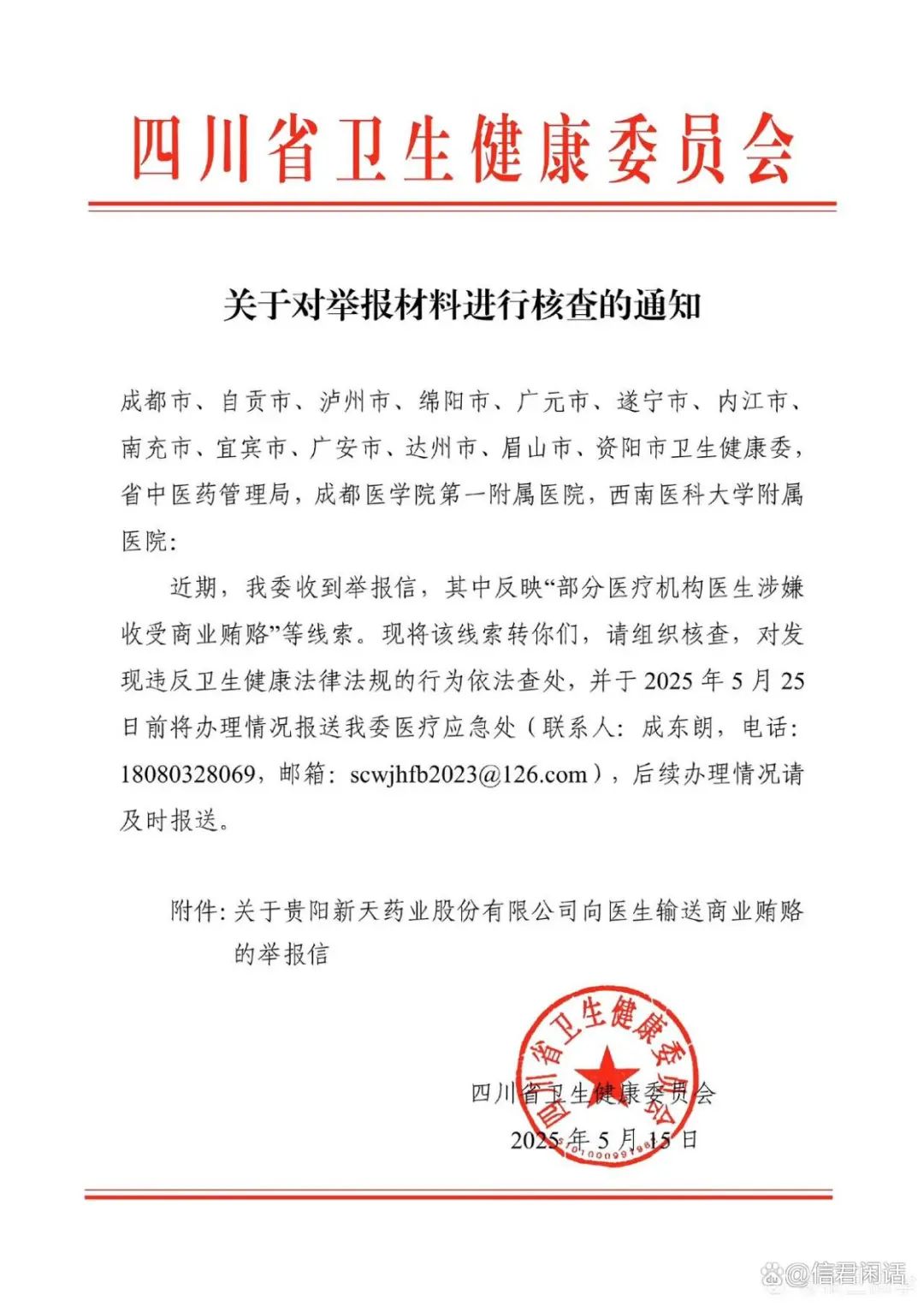 2025年5月,一封实名举报信将深交所上市公司新天药业推上舆论风口浪尖。举报信直指其成都分公司涉嫌通过虚假项目、礼品宴请、超标讲课费等方式,向四川多家医院的上百名医生输送利益。5月15日,四川省卫健委紧急下发核查通知,要求成都、自贡、泸州等13个地市卫健委及多家省级医院对举报线索展开彻查,并明确“依法严肃处理违规行为”。