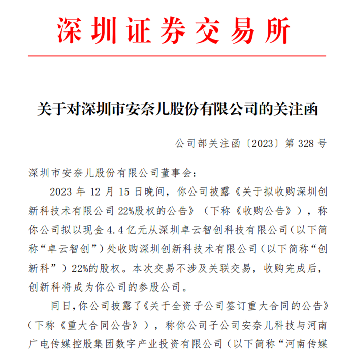 针对深交所关注函中提及的相关风险问题,截至发稿前安奈儿尚未予以公开回应。据此,未来网记者向安奈儿发送了采访函,安奈儿董秘办相关负责人回应称,对于创新科的股权收购并非如业界猜测的从童装跨界布局大数据产业,而是在发展童装业务的同时探索一些新的业务增量。此外,该负责人称,预计此轮收购不会对公司的现金流和经营情况产生重大影响。