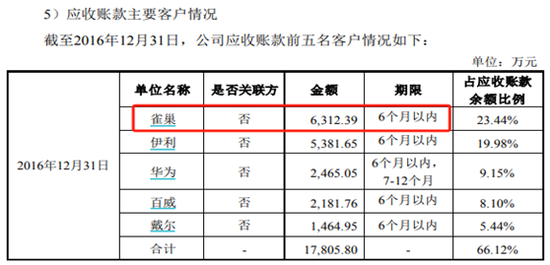 根据招股说明书披露的“应收账款主要客户情况”信息,截止2016年末该公司对大客户雀巢的应收账款余额为6312.39万元,且账龄全部为6个月以内,这也是当时元隆雅图应收账款的第一大赊账客户。