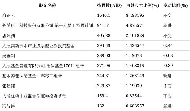 2022年一季度末的公司十大流通股东中,新进股东为长缆电工科技股份有限公司-第一期员工持股计划、基本养老保险基金一零零三组合、冯波涛,取代了此前的兴业证券股份有限公司、南方匠心优选股票型证券投资基金、大成策略回报混合型证券投资基金。在具体持股比例上,大成高新技术产业股票型证券投资基金、吴蓉翔、大成基金管理有限公司-社保基金17011组合持股有所下降。