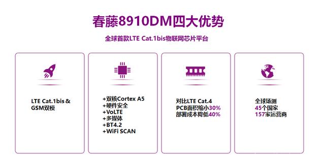 作为全球首款LTE Cat.1 bis物联网芯片平台,该芯片采用28nm成熟工艺,支持LTE Cat.1 bis和GSM双模,上行速率达5Mbps,下行速率达10Mbps,并拥有高集成度,同时集成了蓝牙通讯和Wi-Fi室内定位,可实现更稳定的连接,支持VoLTE,通过系统优化设计,使得春藤8910DM可实现显著的低功耗优势。