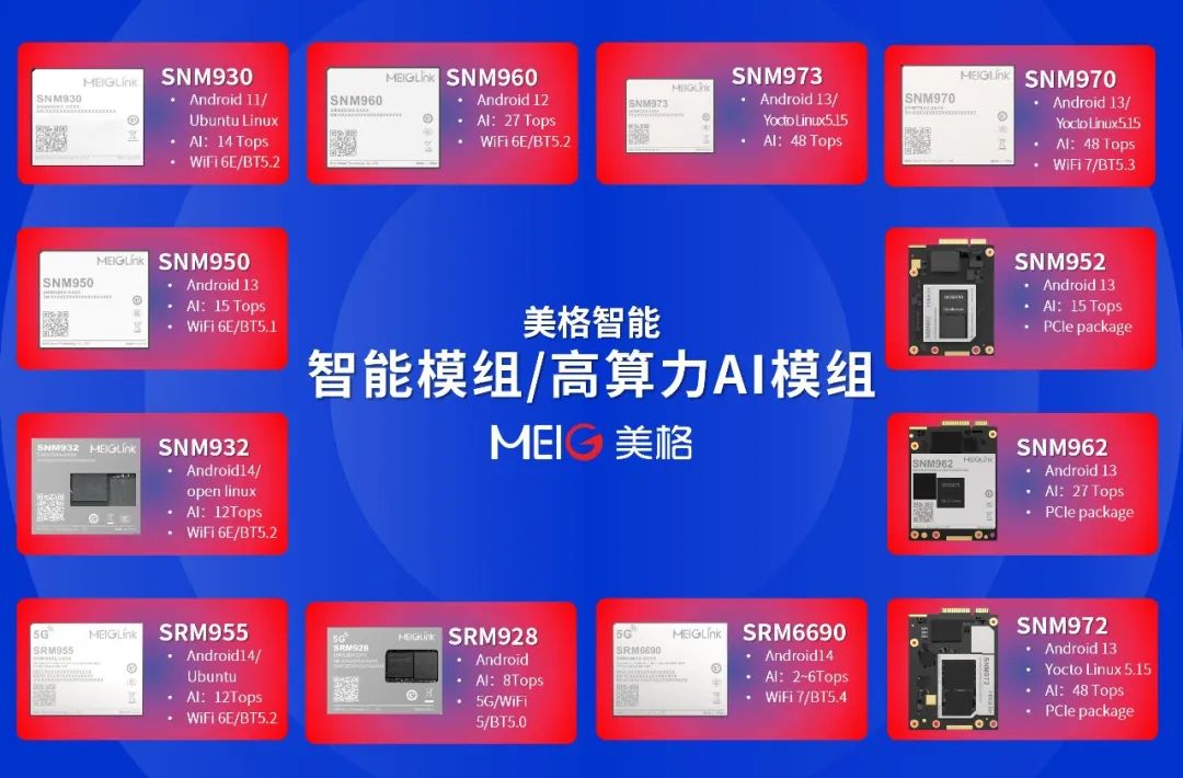 从开创到引领,美格智能以端侧算力为切入点,行业率先打造高算力AI模组矩阵,凭借优质的产品品质和定制化服务能力受到行业客户的一致好评。算力是端侧AI运行的基座,针对不同客户对算力、功耗、尺寸的要求,美格智能打造包含SNM973、SNM932、SNM950、SNM960、SNM970、SNM952、SNM962、SNM972等系列模组,AI算力覆盖12Tops~48Tops,涵盖入门级、中端、旗舰级多层次算力水平,能够适应不同行业和应用场景的需求。同时在高算力AI模组的基础上,美格智能团队正不断与行业领先的SoC阵列式服务器客户密切合作,相关产品成为各类端侧通用AI、边缘计算AI服务器的优质选择,凭借高性能和高性价比助力边缘侧AI部署,推动边缘侧算力发展。