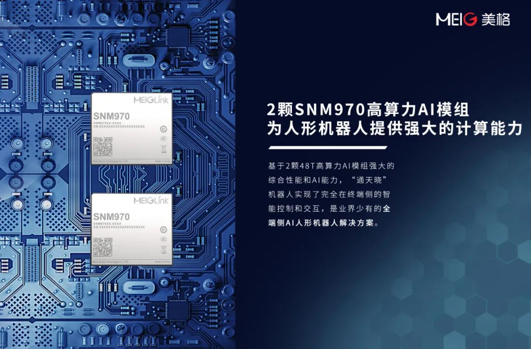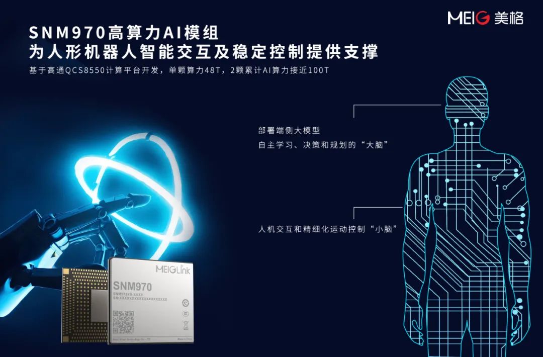 在本次合作中,“通天晓”机器人主控制器上,搭载了2颗美格智能基于高通QCS8550计算平台开发的高算力AI模组SNM970,单颗算力48T,累计AI算力接近100T,为人形机器人的整体控制系统提供了强大的计算能力。基于高算力AI模组的SoC异构计算能力,8核CPU可以保证多任务并行处理,强大的GPU支撑机器人进行视觉感知,专为AI计算设计的NPU则为端侧大模型的部署提供支撑。软件生态上支持在一套高算力板卡上同时运行安卓、Linux等多种操作系统,为机器人智能交互及稳定控制提供软件生态支撑。
