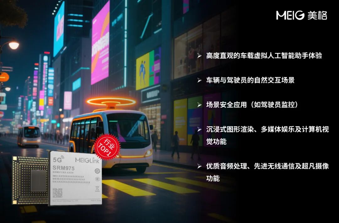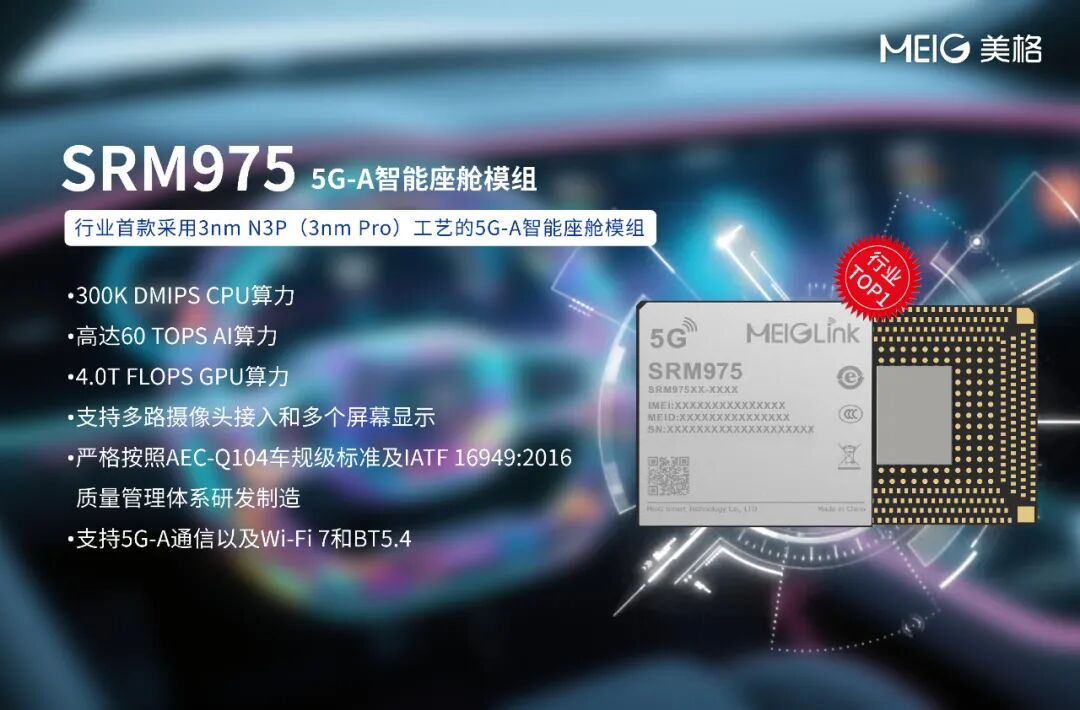 多年深耕,美格智能持续推出行业领先的智能座舱模组产品,继推出行业首款48 TOPS AI算力的5G智能模组SRM965之后,美格智能在智能座舱领域持续发力,全新5G-A智能座舱模组SRM975 AI算力已达到60 TOPS的行业顶尖水平,超高性能成为当前行业TOP1的5G-A智能座舱模组。