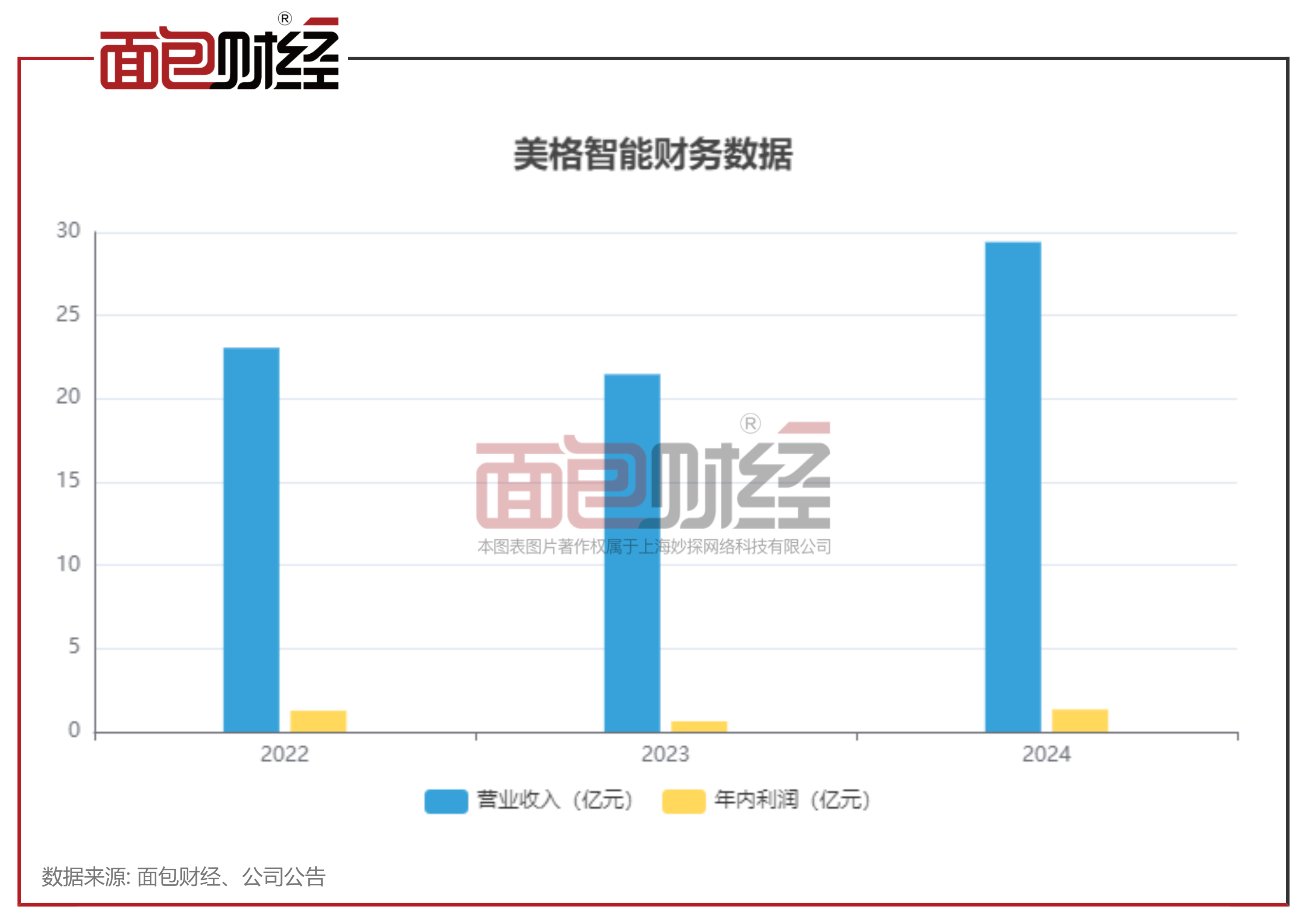美格智能营收从2022年的23.06亿元下降至2023年的21.47亿元,2024年反弹至29.41亿元;年内利润分别为1.27亿元、0.63亿元、1.34亿元。同期,毛利率呈波动下降,分别为17.6%、18.4%、16.5%。