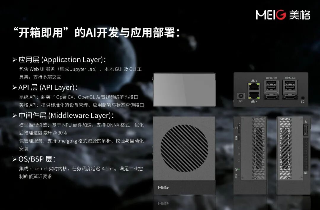 中间件层:核心包含基于NPU硬件加速的模型推理引擎,支持ONNX格式,经优化后推理速度提升≥30%;以及包管理服务,支持专属的.meigpkg格式资源管理,实现应用的自动化安装与版本控制。