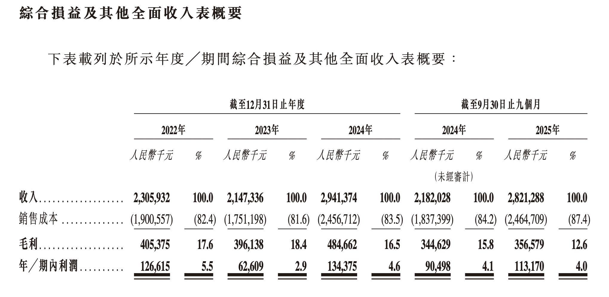 据招股书,2022年-2024年及2025年前三季度,美格智能实现收入分别为23.06亿元、21.47亿元、29.41亿元、28.21亿元;年/期内利润分别为1.27亿元、6260.9万元、1.34亿元、1.13亿元。