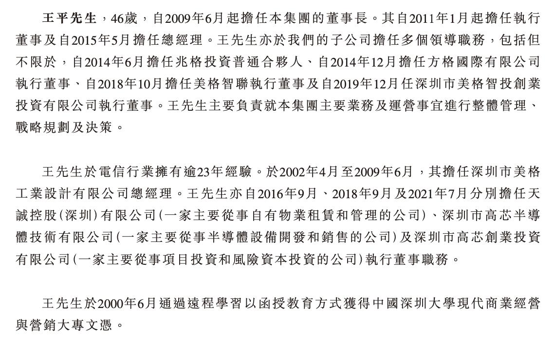 资料显示,王平,46岁,自2009年6月起担任集团的董事长。其自2011年1月起担任执行董事及自2015年5月担任总经理。王平亦于公司的子公司担任多个领导职务,包括但不限于,自2014年6月担任兆格投资普通合伙人、自2014年12月担任方格国际有限公司执行董事、自2018年10月担任美格智联执行董事及自2019年12月任深圳市美格智投创业投资有限公司执行董事。王平主要负责就集团主要业务及运营事宜进行整体管理、战略规划及决策。