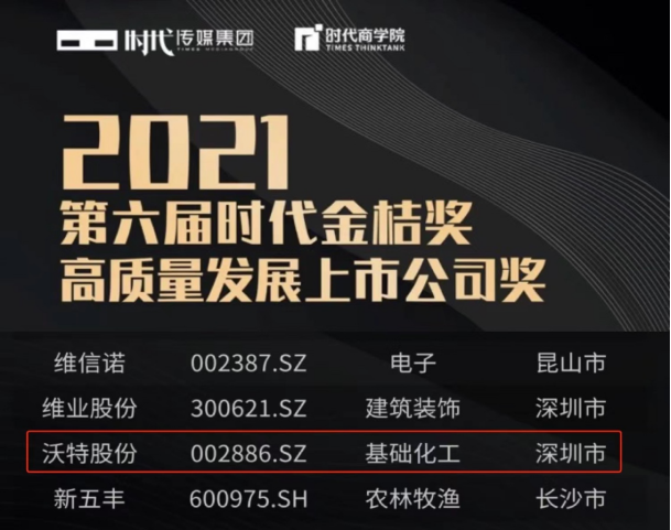 沃特股份凭借在公司经营、技术创新、品牌塑造、业绩增长、融资并购等方面的突出表现,荣获金桔奖“2021高质量发展上市公司奖”。