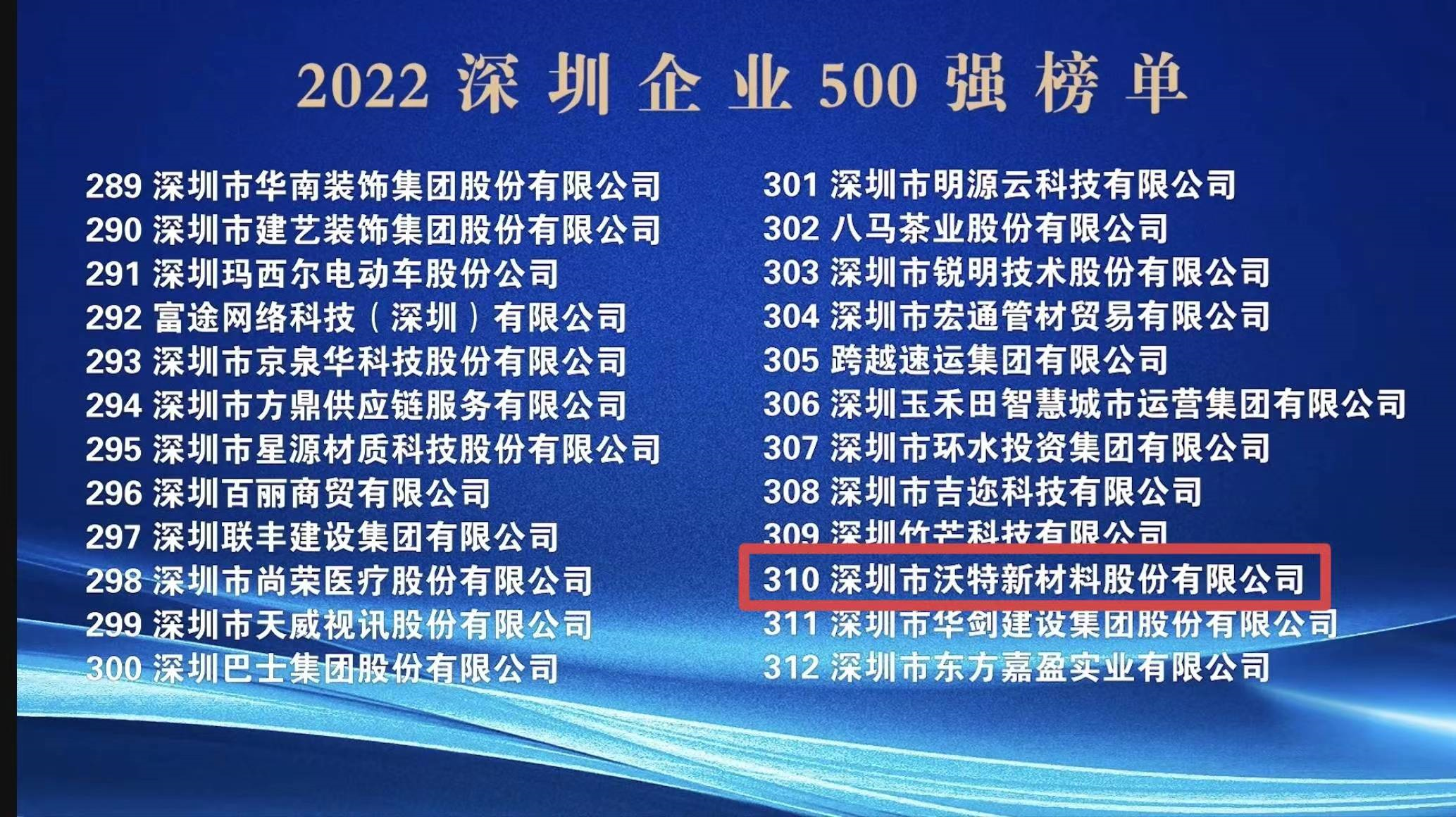 “深圳企业500强榜单”是由深圳市企业联合会、深圳市企业家协会联合发布,以企业综合经营指标为主要依据,全面系统地反映深圳企业发展的现状和趋势,体现了上榜企业在深圳乃至全国范围所处行业综合实力和竞争力。沃特股份由2021年的第359位提升至第310位,已连续三年入围该榜单,持续为深圳市产业经济高质量发展输送动能与活力。