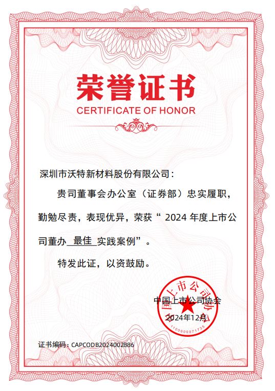 入选“2024董办最佳实践案例”的280家上市公司中,沪市上市公司175家,占62.5%;深市上市公司105家,占37.5%。沃特股份连续两年入选,体现了中国上市公司协会对沃特股份合规治理经营理念及健全、高效的管理实践的高度认可。