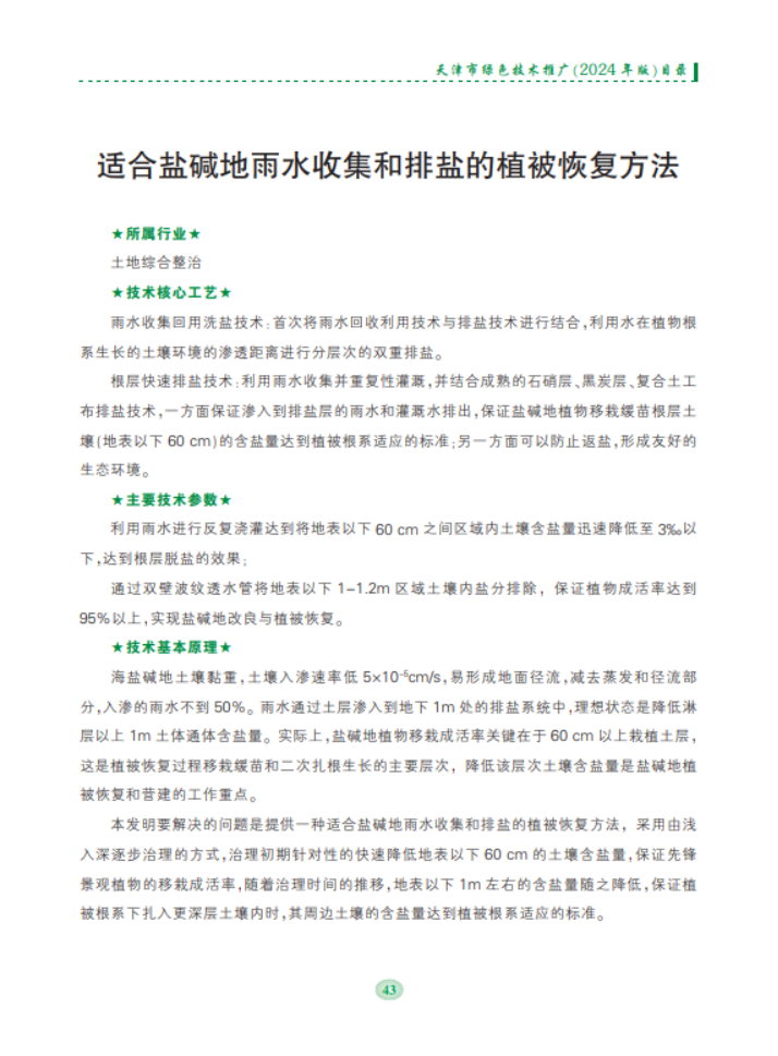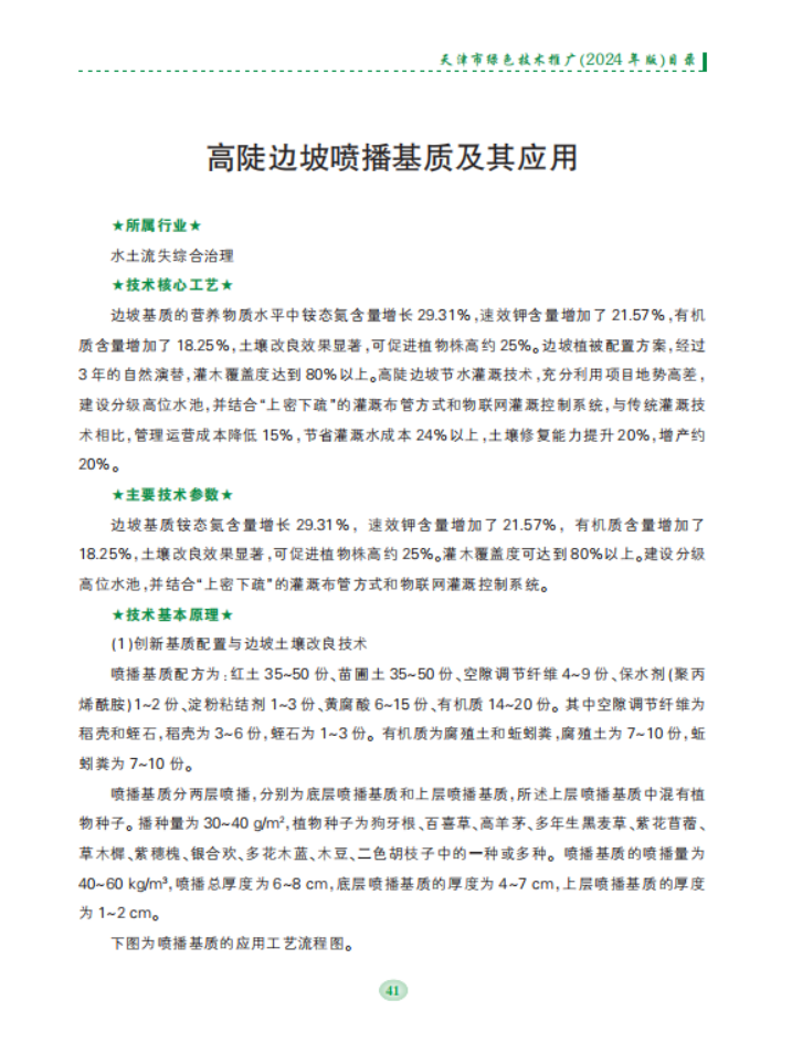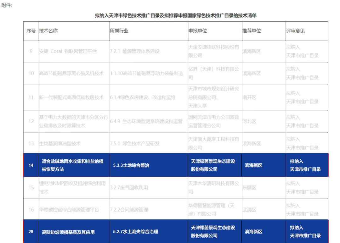 近日,我司“适合盐碱地雨水收集和排盐的植被恢复方法”和“高陡边坡喷播基质及其应用”两项自主研发技术,正式列入由天津市发展改革委组织开展的《天津市绿色技术推广目录(2024年版)》。据悉,本次共有30家企业的绿色技术从天津市百余家企业中脱颖而出,绿茵生态是名录中唯一一家“生态修复和利用”行业的绿色高新技术企业。