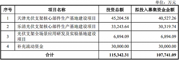 按照该公司规划,此轮定增募资将用于天津光伏支架核心部件生产基地建设项目(拟使用募资4.05亿元,下同)、乐清光伏支架核心部件生产基地建设项目(3.03亿元)、光伏支架全场景应用研发及实验基地建设项目(6894.09万元)以及补充流动资金(3亿元)。