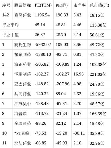 从行业市盈率排名来看,公司所处的化学制药行业市盈率平均45.14倍,行业中值26.37倍,赛隆药业排名第142位。