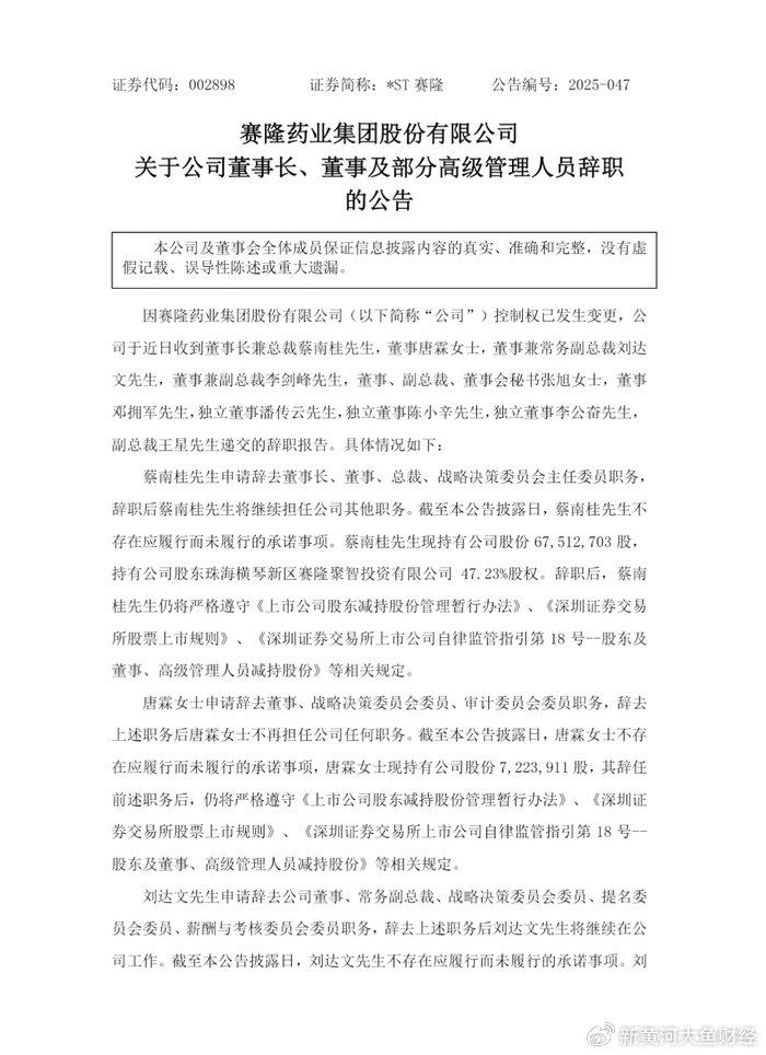 具体而言,*ST赛隆第四届董事会共有9名董事,此次辞职涉及所有董事会成员。其中,蔡南桂申请辞去董事长、董事、总裁、战略决策委员会主任委员职务,辞职后将继续担任公司其他职务。截至公告披露日,蔡南桂持有公司股份6751.27万股,持有珠海横琴新区赛隆聚智投资有限公司47.23%股权。