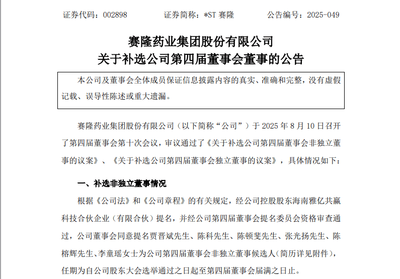 为了填补管理层空缺,8月10日,*ST赛隆董事会审议通过了补选非独立董事、独立董事以及聘任总裁的议案。经海南雅亿提名,并经提名委员会资格审查,董事会同意提名贾晋斌等6人为非独立董事候选人,王淑芳等3人为独立董事候选人。同时,董事会决定聘任陈科为公司总裁。