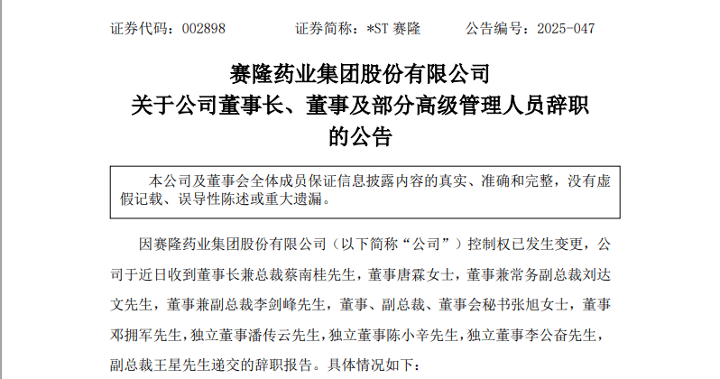 近日,*ST赛隆宣布公司控制权发生重要变更,伴随着这一变动,公司第四届董事会的全体成员及部分高级管理人员已集体提交辞职报告。