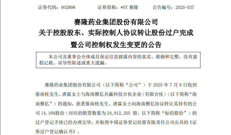*ST赛隆此次管理层变动的主要原因在于公司控制权的变更。7月9日,公司宣布蔡南桂、唐霖所持的14.16%股份已转让给海南雅亿,并完成过户登记手续。这一变更使得海南雅亿成为*ST赛隆的新控股股东。