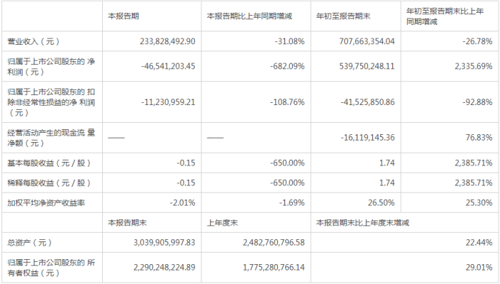 10月26日晚间,哈三联发布了今年前三季度业绩公告,报告期内,该公司实现营业收入约7.08亿元,同比下降26.78%。实现归属于上市公司股东的扣非前和扣非后净利润分别约为5.4亿元和-4153万元,同比分别增长了2335.69%和下降了682.09%。实现基本每股收益-0.15元,同比下降650%。