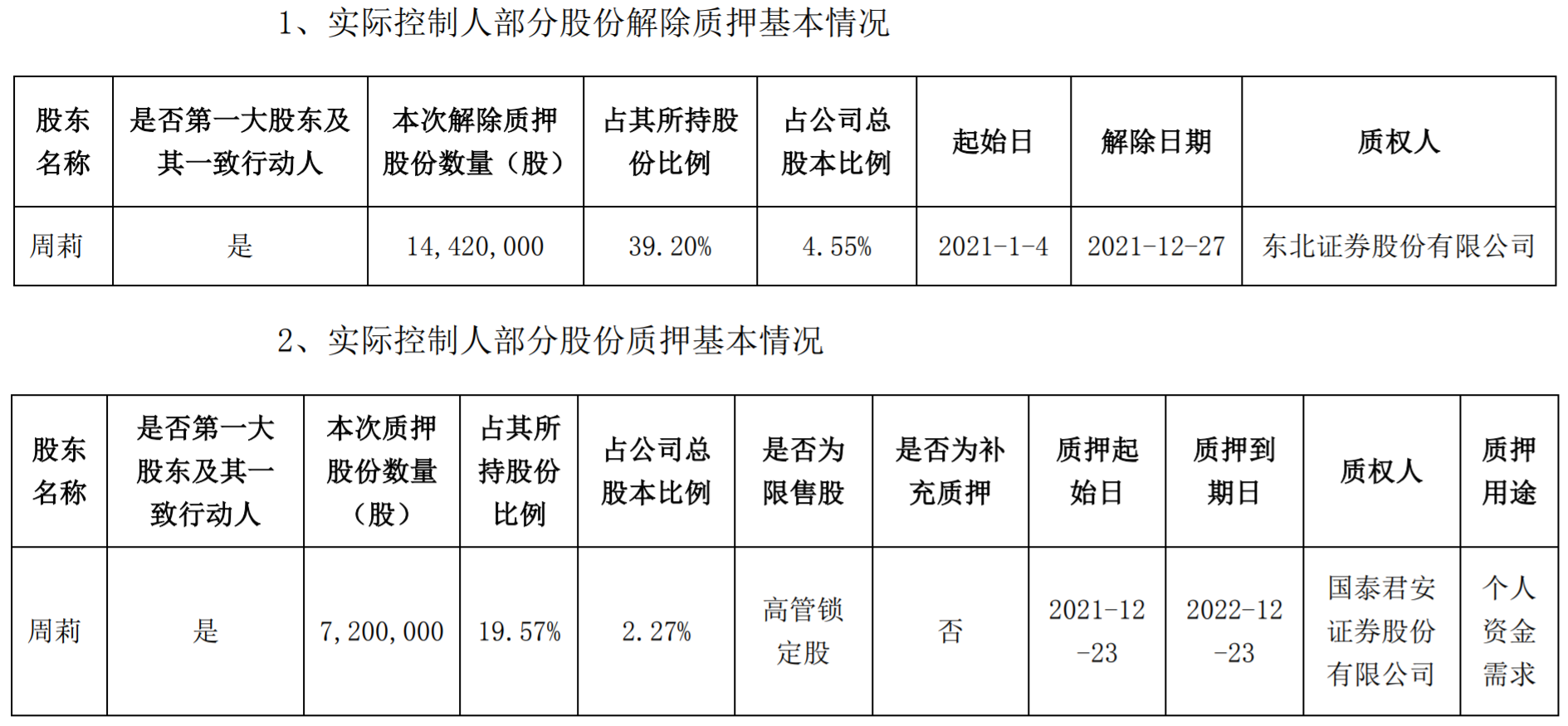 公告显示,哈三联于近日接到实际控制人周莉的通知,获悉周莉将其持有的哈三联部分股份办理解除质押及再质押:1442万股股份解除质押,占哈三联总股本比例为4.55%;质押720万股股份,占哈三联总股本比例为2.27%。