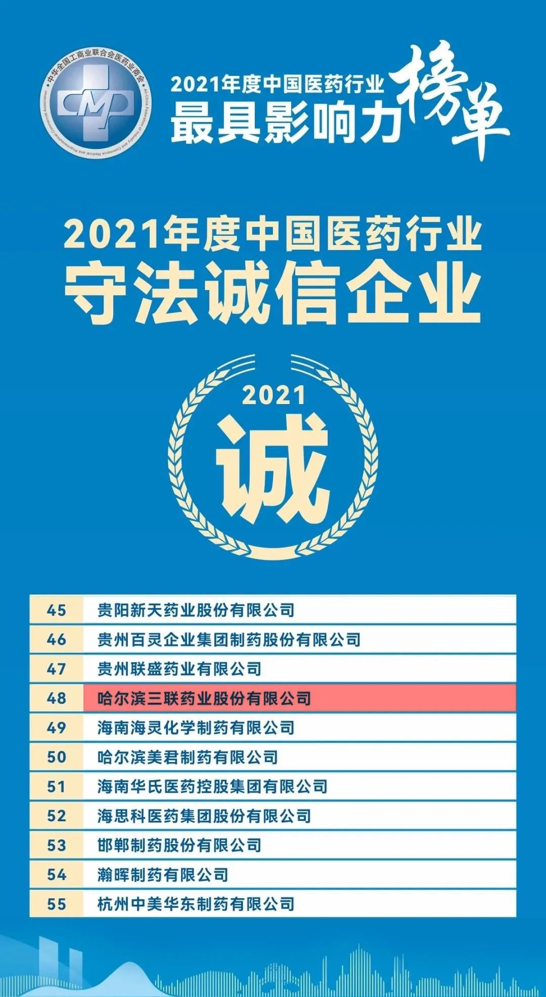 近日,全国工商联医药业商会网络发布2021年度中国医药行业最具影响力榜单,哈三联喜获年度中国医药行业守法诚信企业。