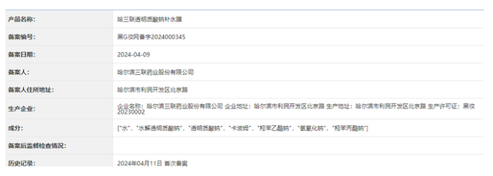 也就是说在2022年5月前,哈三联还未申请相关化妆品生产及产品资质。不过在2023年年报中,哈三联在大健康板块把食品、医疗器械、化妆品列为核心的三大业务分支。并称:医疗器械及化妆品板块方面,依托在医用敷料方面成熟的研发生产经验,2023年内获批生产第二类医疗器械“医用透明质酸钠修复贴”及化妆品“哈三联透明质酸钠修护膜”。