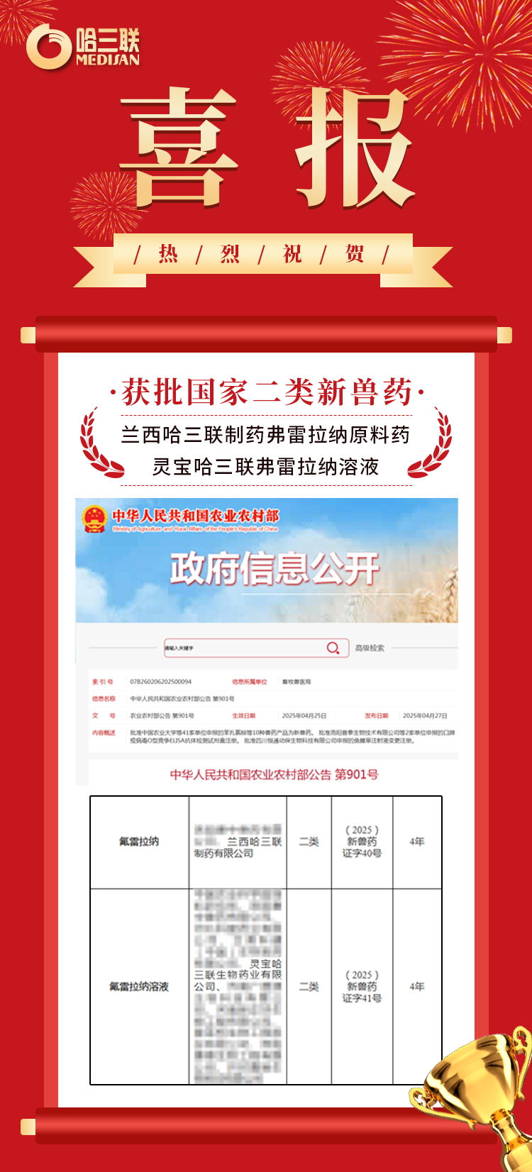 4月25日,中国农业农村部发布第901号公告,哈三联全资子公司兰西哈三联制药申报的动保原料药氟雷拉纳、灵宝哈三联申报的氟雷拉纳溶液双双获批国家二类新兽药,并核发《新兽药注册证书》,填补了国内自研异噁唑啉类杀虫剂产品空白。