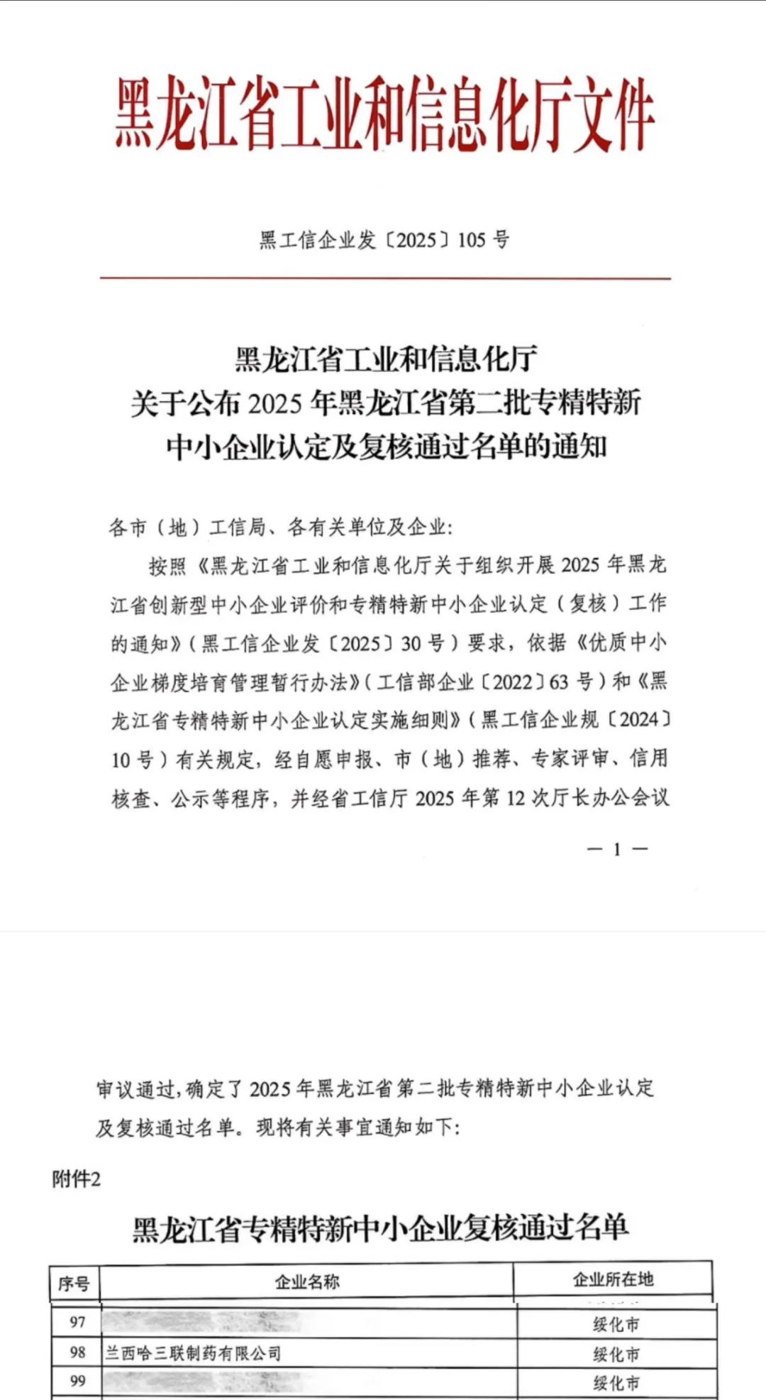 7月17日,黑龙江省工业和信息化厅公布了2025年第二批“专精特新”中小企业认定及复核通过名单,哈三联全资子公司兰西哈三联制药顺利通过复核,再次被认定为黑龙江省“专精特新”中小企业。