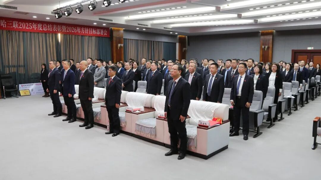 1月23日下午13:30,哈三联2025年度总结表彰暨2026年方针目标部署会在庄严的国歌声中拉开序幕,各中心、事业部、子公司部长及以上管理类人员和专业经理以上人员齐聚一堂,梳理全年工作成果,表彰先进集体和个人,明确2026年工作思路与目标。