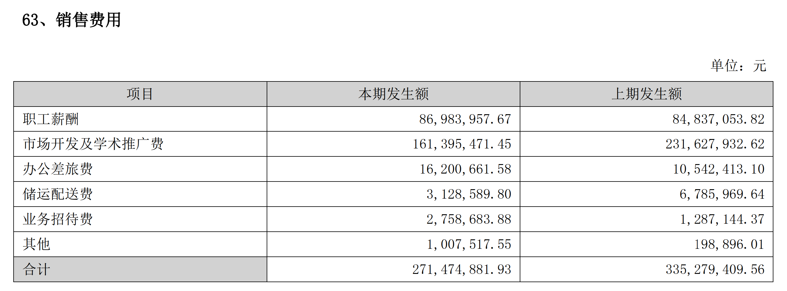 从销售费用的细项上看,与去年同期相比降幅最大的是“市场开发及学术推广”费,同比下降了约0.7亿元。