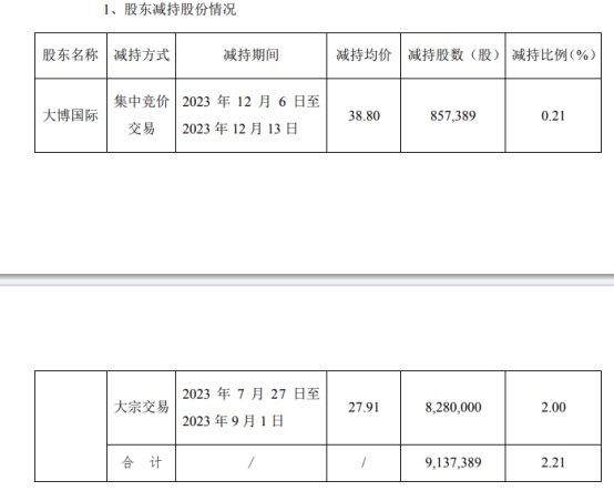 2023年12月6日至2023年12月13日,大博国际通过集中竞价交易减持公司857,389股,减持比例0.21%,减持均价38.80元,减持金额3326.67万元;2023年7月27日至2023年9月1日,大博国际通过大宗交易减持公司8,280,000股,减持比例2.00%,减持均价27.91元,减持金额23109.48万元。