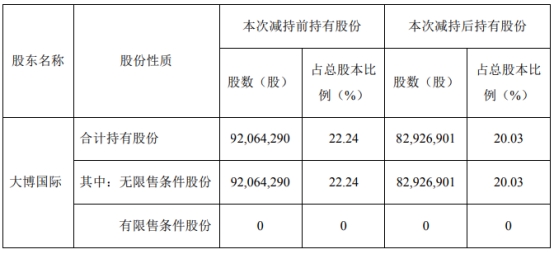 本次减持前,大博国际持有大博医疗92,064,290股,占总股本比例22.24%;本次减持后,大博国际持有大博医疗82,926,901股,占总股本比例20.03%。