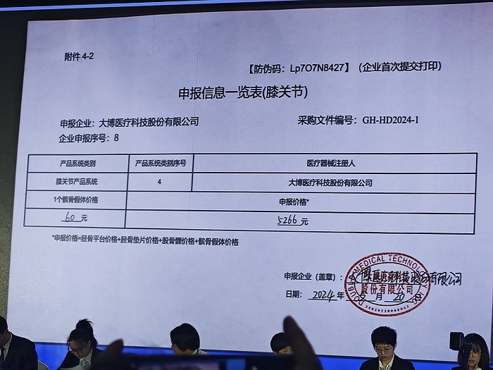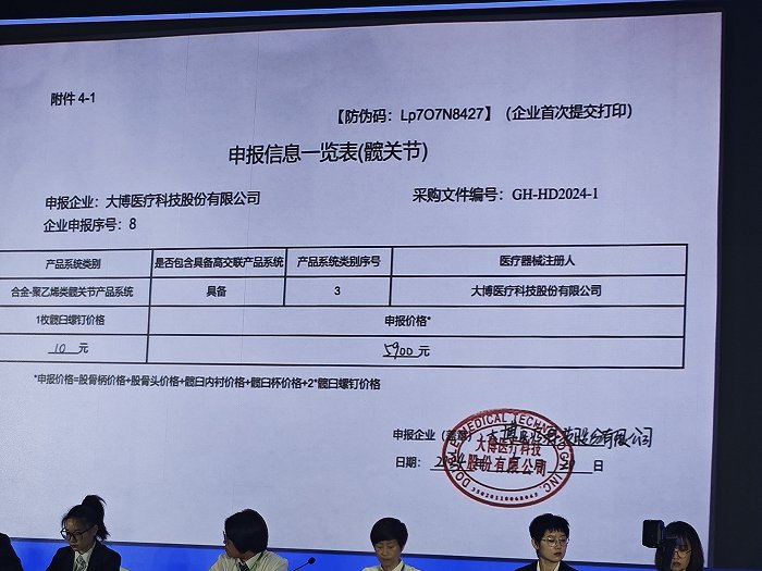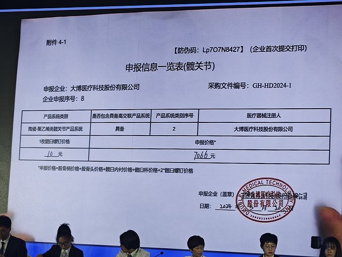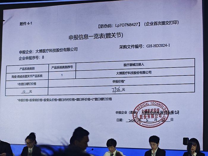 界面新闻记者从正在进行的国家组织人工关节集中带量采购协议期满接续采购现场获悉,大博医疗共申报4个产品,价格如下: