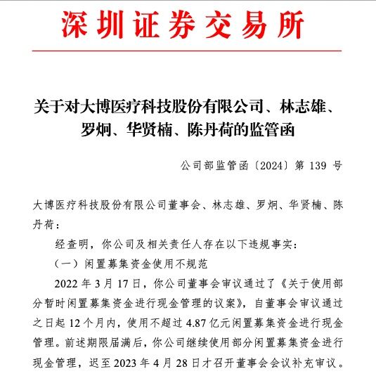 8月4日晚间,深圳证券交易所下发关于对大博医疗科技股份有限公司(以下简称“大博医疗”或“公司”)、林志雄、罗炯、华贤楠、陈丹荷的监管函。监管函称,大博医疗及相关责任人存在闲置募集资金使用不规范、关联人名单及关联关系披露不完整、年度报告信息披露存在错误、内部制度执行不到位、管理不规范等违规事实。