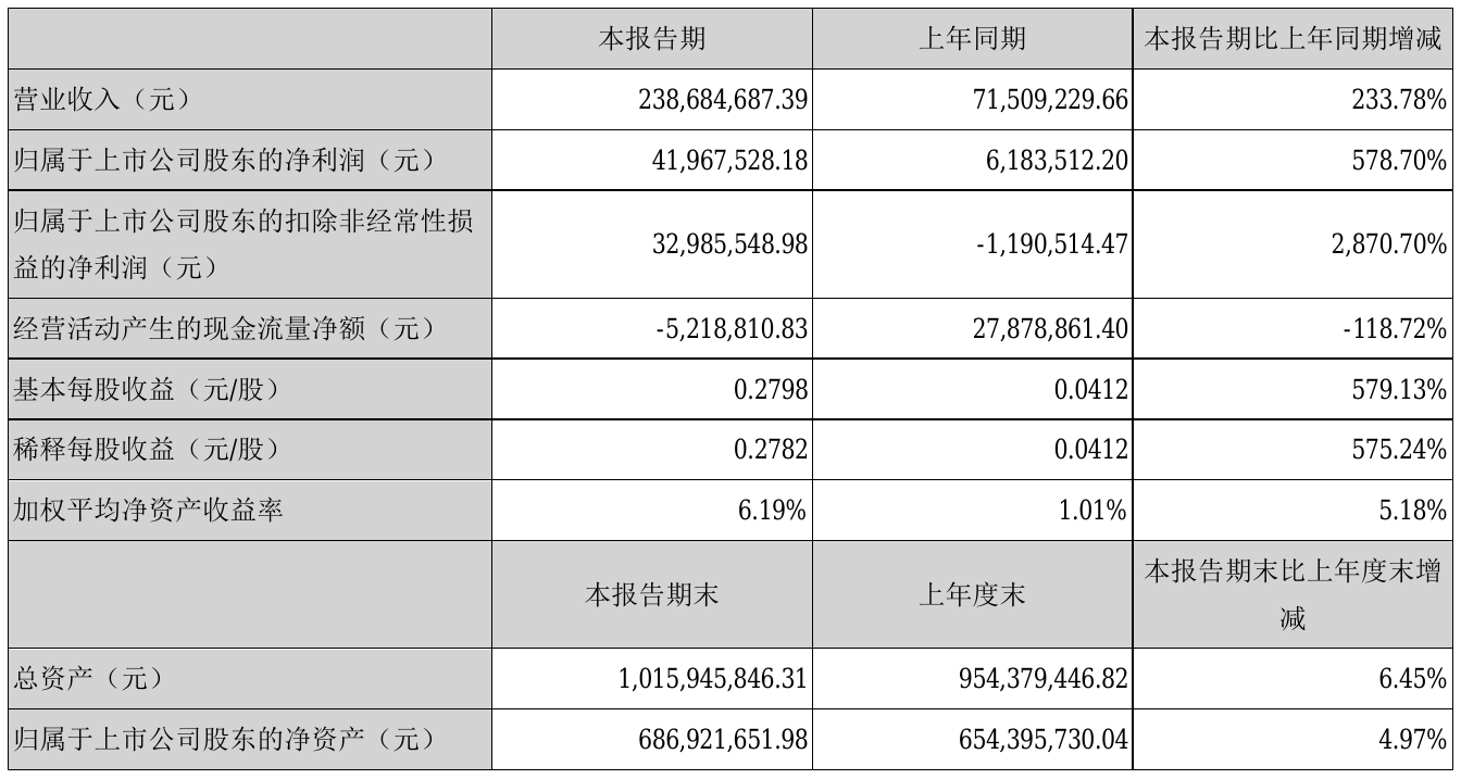 挖贝网8月20日,宇环数控(002903)近日发布2021年半年度报告,报告期内营业收入238,684,687.39元,同比增加233.78%;净利41,967,528.18元,同比净利增加578.70%。